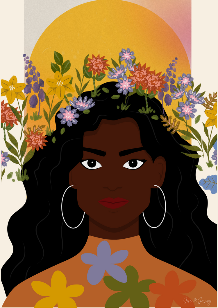 Featuring warm earth tones, bold floral details, and a modern illustrative style, it captures the essence of radiance, resilience, and natural beauty.