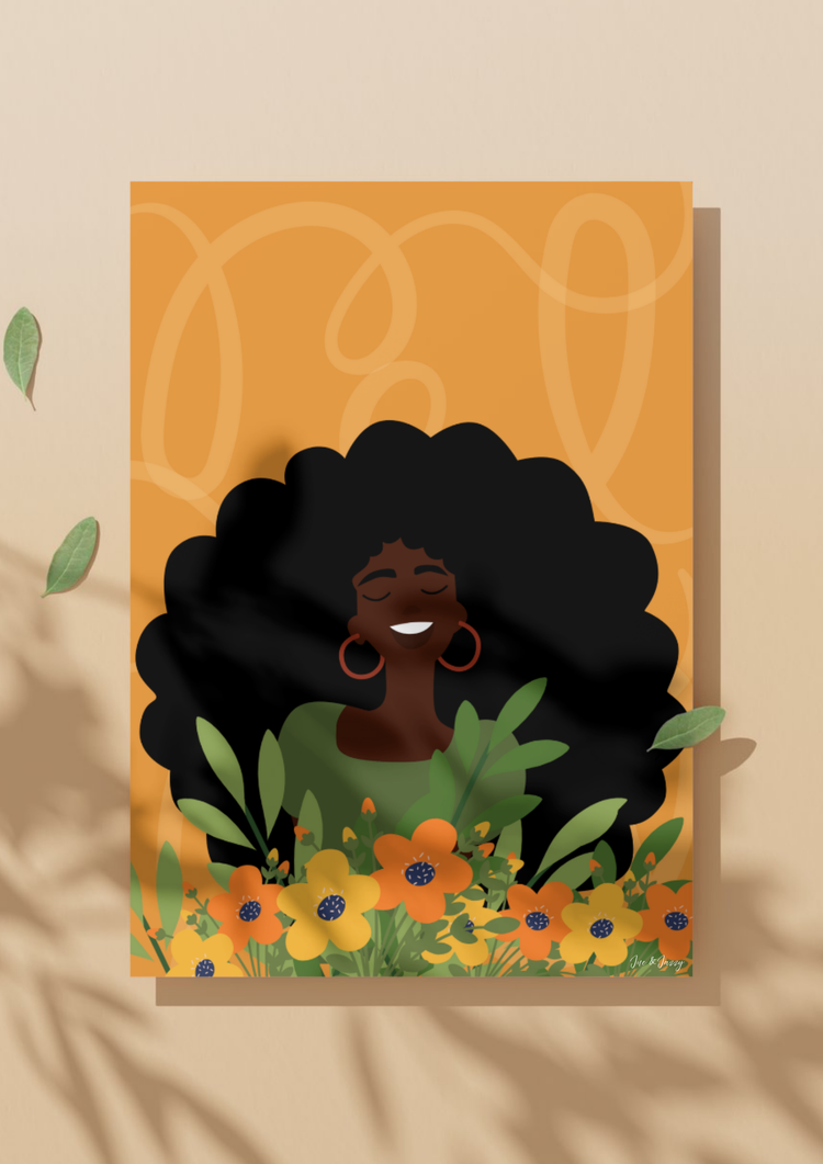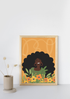 Bring joy and radiance into your space with this uplifting portrait art print. Featuring a graceful Black woman with a natural crown of voluminous hair, surrounded by golden-orange blooms, it captures the essence of confidence, serenity, and inner light.